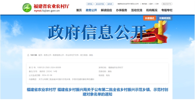 为贯彻落实中共福建省委扶贫开发成果巩固与乡村振兴工作领导小组《关于开展“千村示范引领、万村共富共美”工程走具有福建特色乡村振兴之路的实施意见》,根据农业农村部、国家乡村振兴局“百县千乡万村”乡村振兴示范创建要求,省农业农村厅、乡村振兴局组织开展第二批全省乡村振兴示范乡镇、示范村创建对象申报评审工作,经县级申报、市级审核推荐、省级评审确定和公示,同意福州市福清市南岭镇等40个单位为第二批全省乡村振兴示范乡镇创建对象、福州市福清市东张镇道桥村等500个单位为第二批全省乡村振兴示范村创建对象,现予公布。